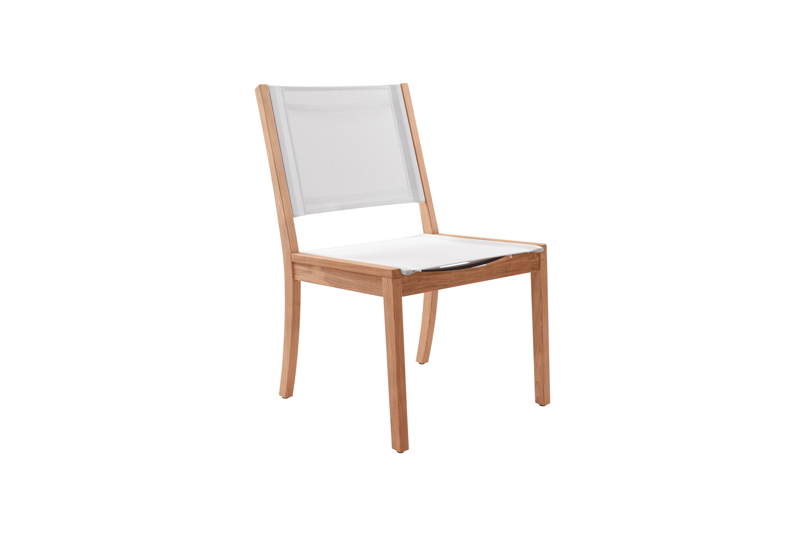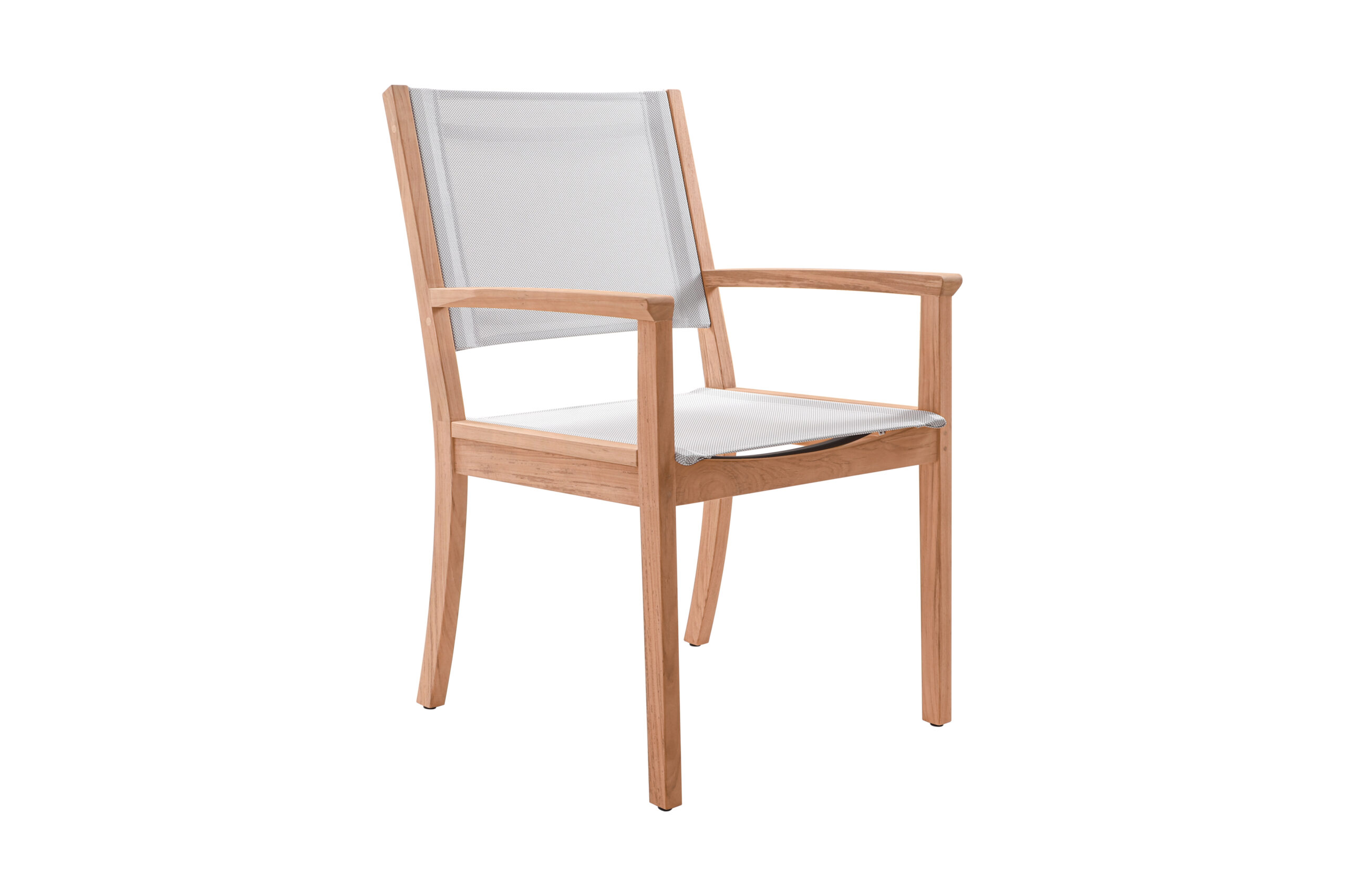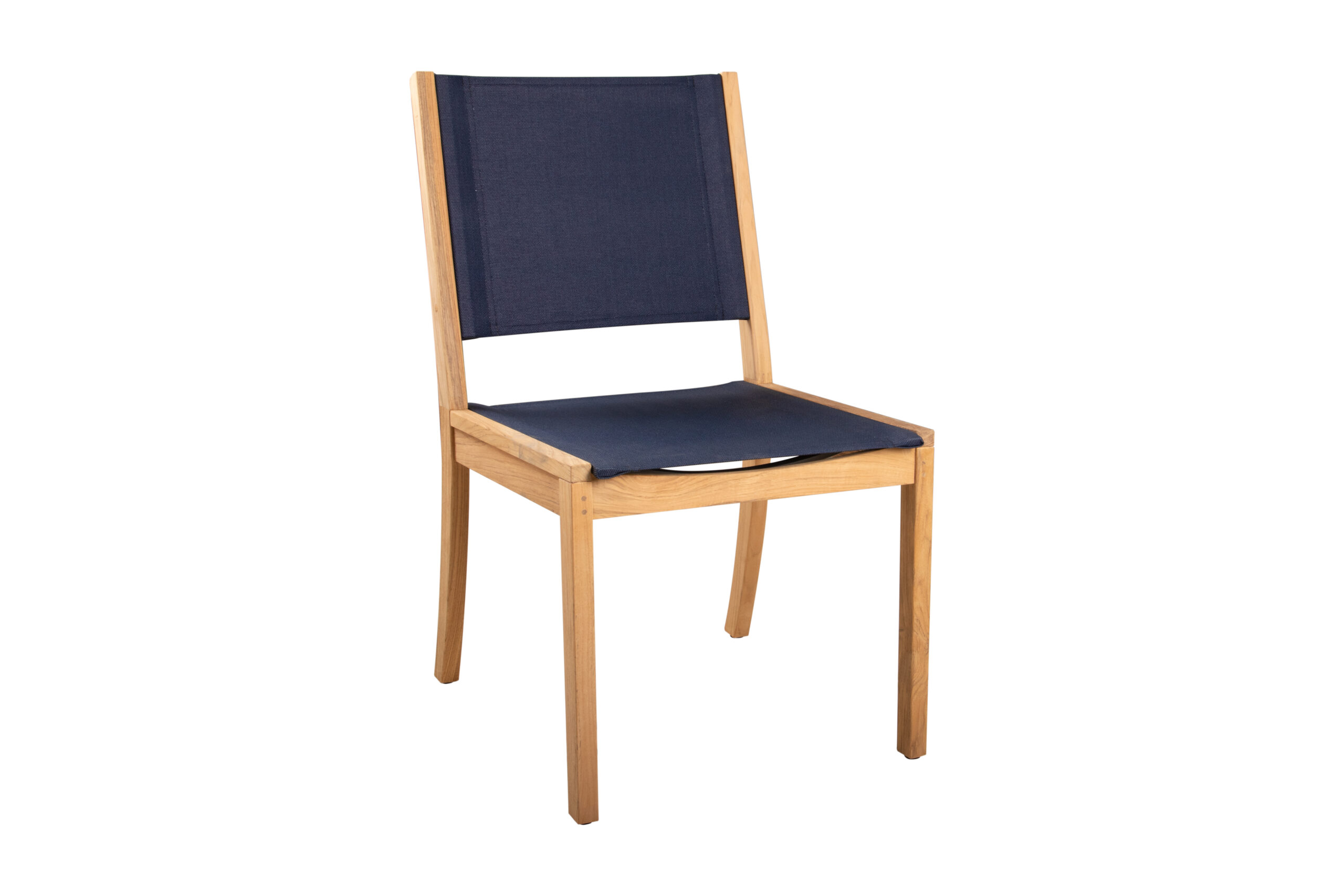 Made from sustainably sourced grade A teak and powder coated aluminum. Available in ocean (navy) and white slings. Arm chairs or side chairs.