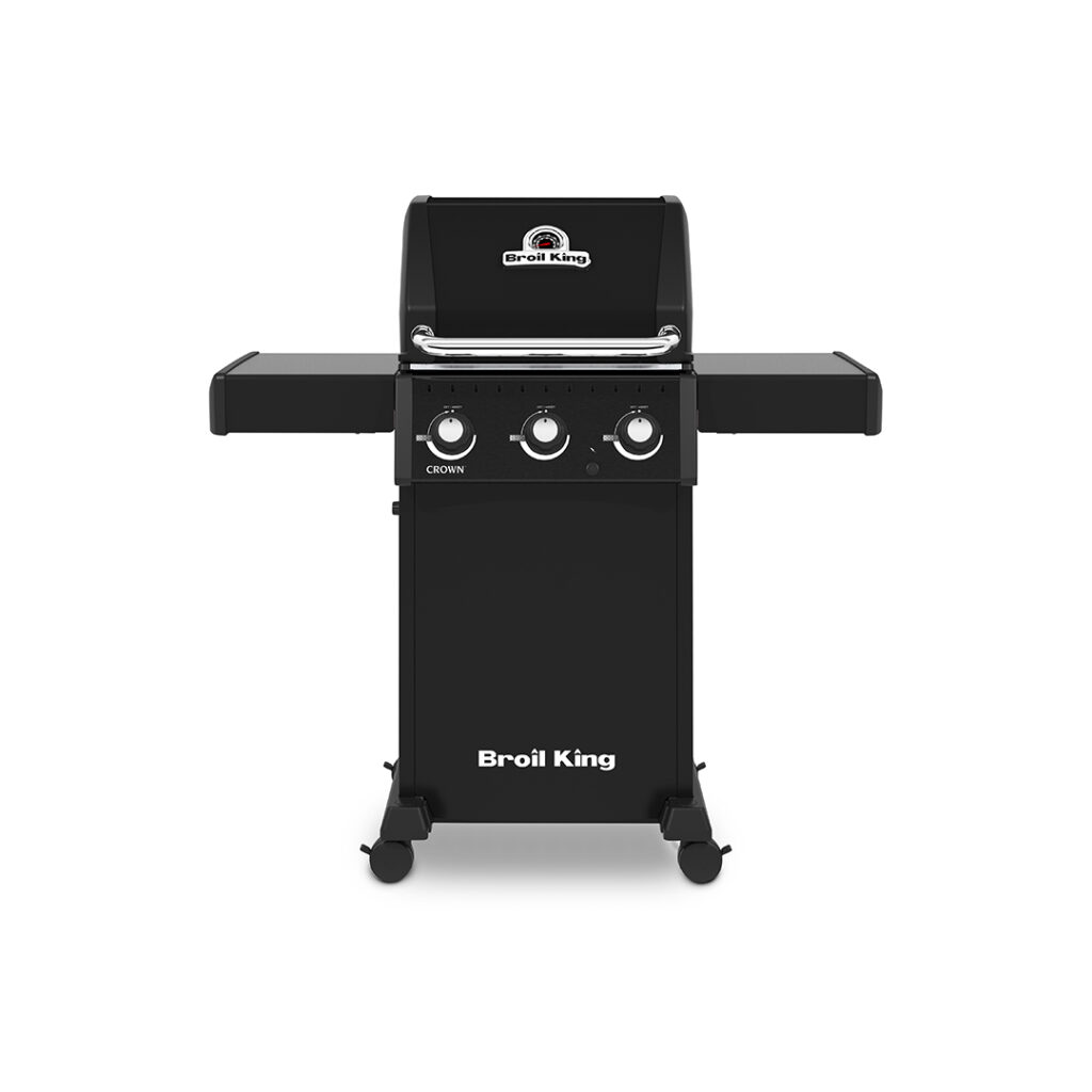 The Broil King® Crown™ 300 Series features a durable cast aluminum oven, 3 stainless steel Dual-Tube™ burners, stainless steel Flav-R-Wave™ cooking system, and electronic ignition. All Crown 300 series include heavy-duty 3-position cast iron cooking grids, black drop-down side shelves, and an enclosed black cabinet bas