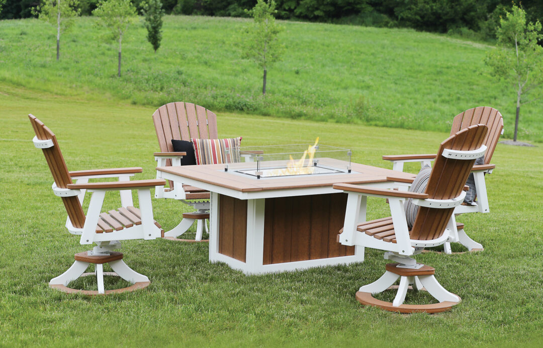 Beautiful and durable. A poly-top fire pit or fire table completes your outdoor area. Available round 44″ and rectangular 42″x54″.
