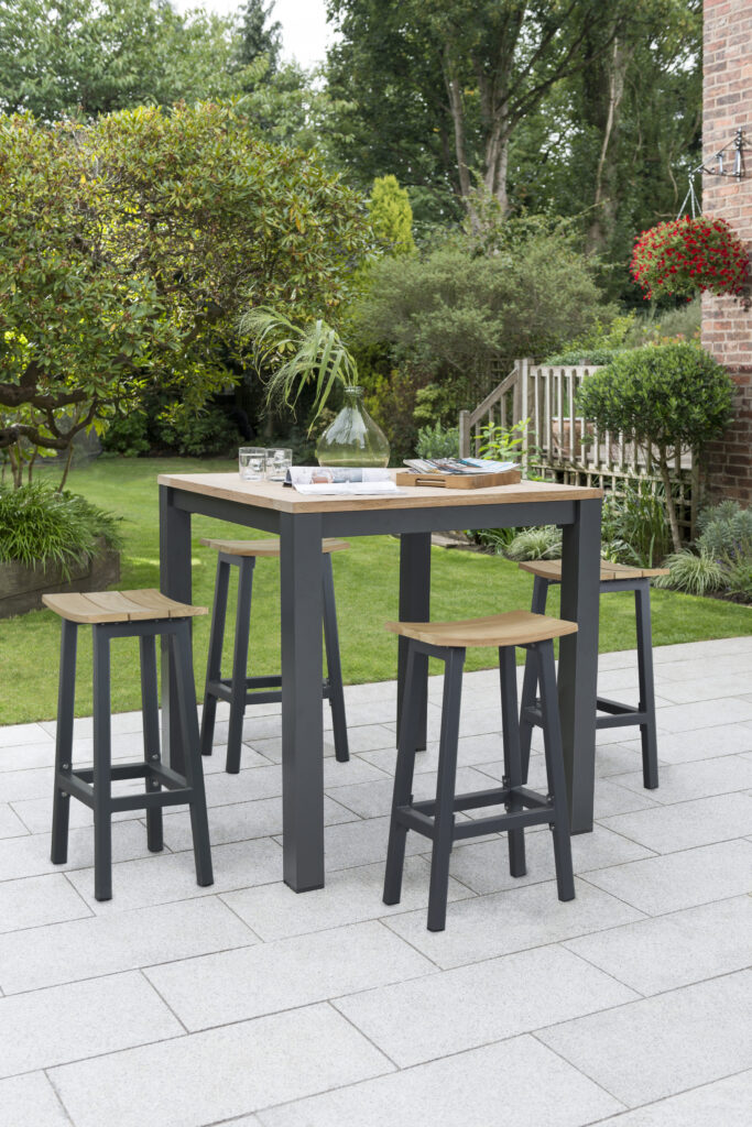 The teak wood table top with slat top style gives a modern rustic design. The aluminum frame is rustproof and weatherproof. The charcoal color compliments the wood on the table top. Combine other Elba Collection pieces to create an inviting outdoor experience to enjoy with family and friends.