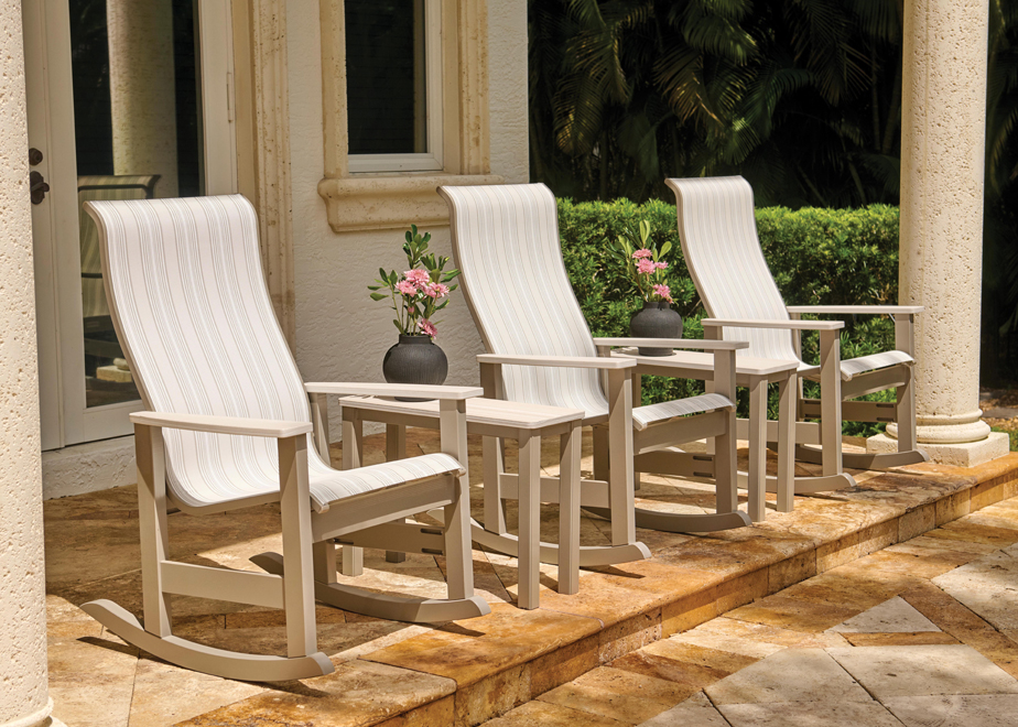 The Leeward Sling Supreme Rocker features durable and replaceable slings that provide amazing comfort without the hassle of cushions. The frame is powder coated aluminum with marine grade polymer arms. There are many color options available.