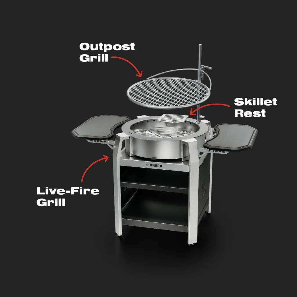 The Live-Fire Grilling Bundle comes with the Outpost Grilling System. Cook over the fire with ease, with this adjustable grill grate.