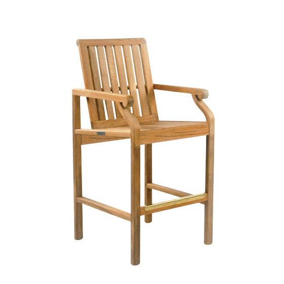 The Nantucket bar chair with curved back and angled seat demonstrates the same exceptional comfort as our Nantucket dining chair. The front foot rest is fitted with a solid brass plate to protect the teak wood. Shown in rollover image with our 36″ Essex bar table.