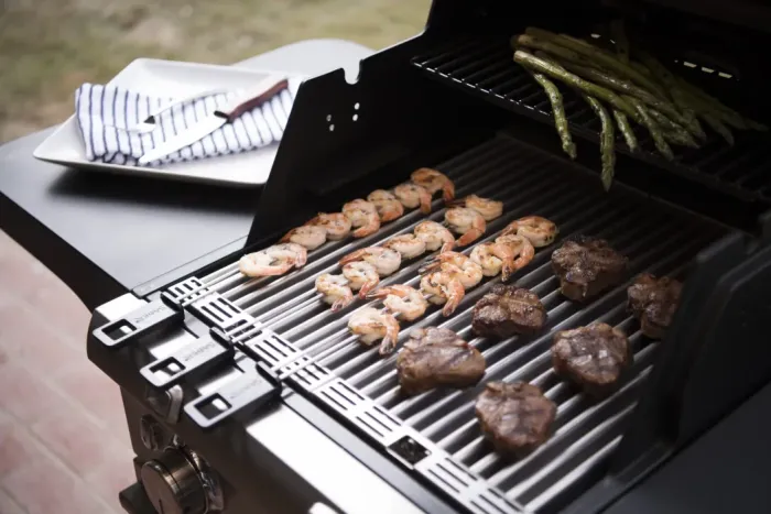 Saber Deluxe Black 2 Burner Gas Grill Brand: Starting At : $ 1099 SABER’s patented grilling system heats evenly, eliminates flare-ups and uses 30% less propane Reliable electronic ignition at each burner for an easy start every time Die cast aluminum end caps provide strength and durability Fully enclosed powder-coated cart with single door for convenient storage Multi-position enamel warming rack adds cooking versatility Easily convert from liquid propane to natural gas with the SABER® EZ Natural Gas Conversion Kit (sold separately) Features: