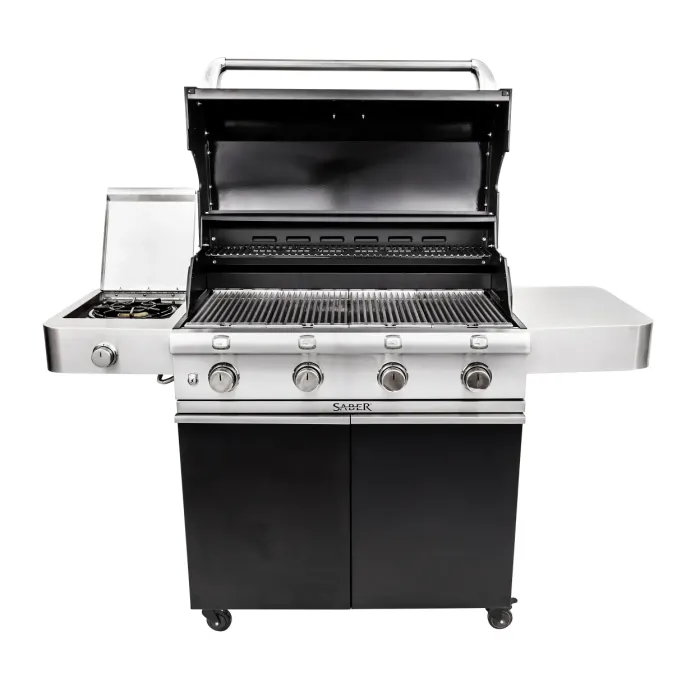 Saber Deluxe Black 4 Burner Gas Grill Brand: Starting At : $ 1999 SABER’s patented grilling system heats evenly, eliminates flare-ups and uses 30% less propane Reliable electronic ignition at each burner for an easy start every time Die cast aluminum end caps provide strength and durability Fully enclosed powder-coated cart with double doors for convenient storage Multi-position enamel warming rack adds cooking versatility Easily convert from liquid propane to natural gas with the SABER® EZ Natural Gas Conversion Kit (sold separately) Features: