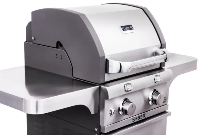 Saber Deluxe Stainless 2 Burner Gas Grill Brand: Starting At : $ 1299 SABER’s patented cooking system heats evenly, eliminates flare-ups and uses 30% less propane Efficiently designed for maximum performance in smaller areas Reliable electronic ignition at each burner for an easy start every time Lid features premium 304 stainless steel insert and die cast aluminum end caps for long-lasting performance Grate-level temperature gauges for versatile lid-up grilling Multi-position porcelain-coated warming rack adds cooking versatility Fully enclosed powder-coated cart with premium 304 stainless steel door and nickel-plated die cast control knobs for strong yet stylish construction Easy-to-access front grease tray for easy clean-up Easily convert from liquid propane to natural gas with the SABER® EZ Natural Gas Conversion Kit (sold separately) Features: