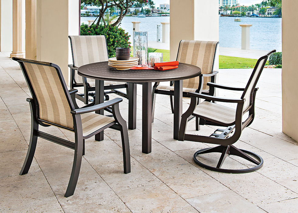 The St. Catherine Sling Arm Chair is a durable and good-looking outdoor dining chair that offers comfort without the hassle of cushions. The frame is made from marine grade polymer and powder coated aluminum. The slings are fade resistant and last a very long time.