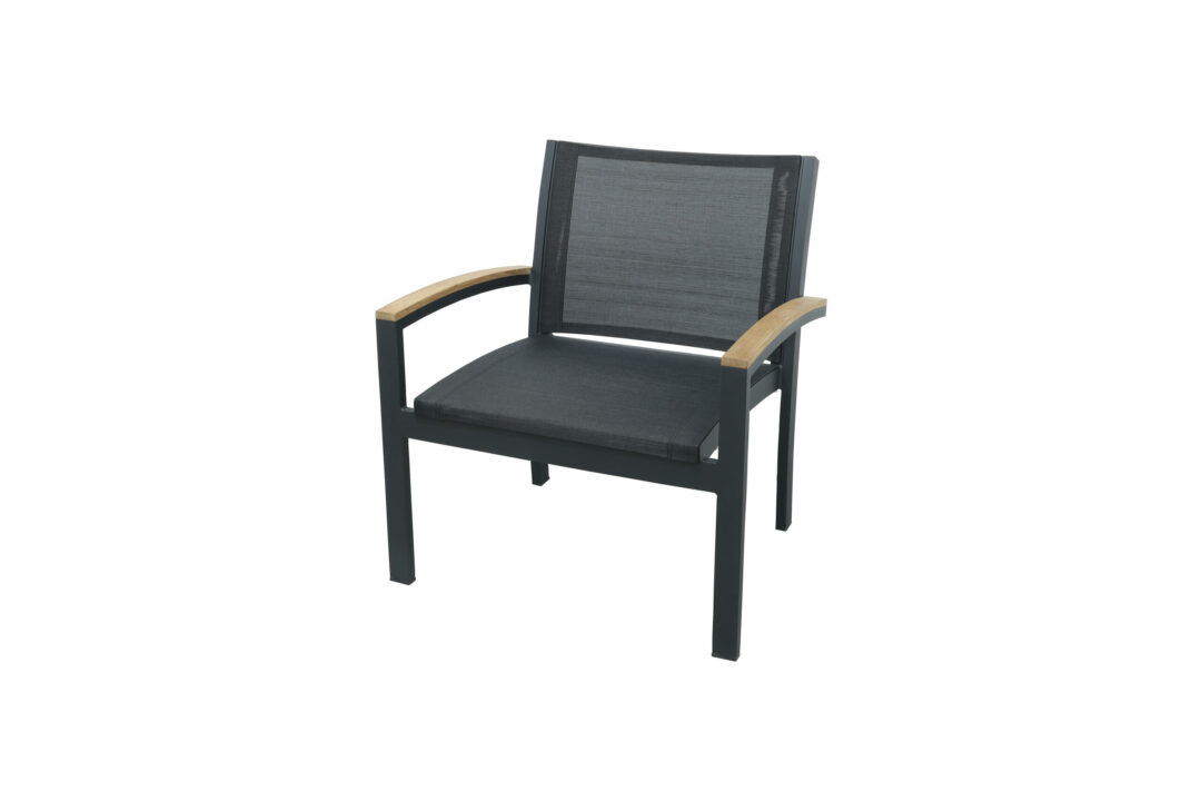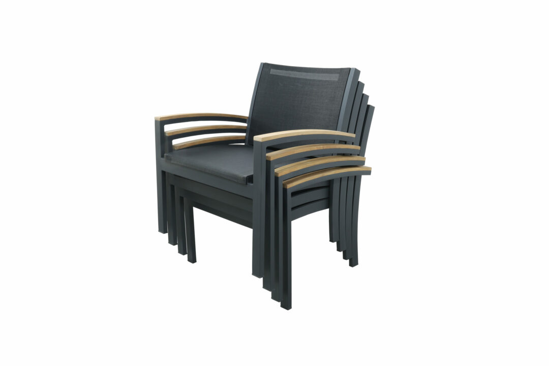 An achievement of modern elegance, the Tribeca collection harbors definitive lines and firm angles, making it the ideal companion to contemporary patios. The ability of each piece to stack up to six (6) units high adds unmatched levels of utility to larger outdoor spaces. The Tribeca collection features a rust-free aluminum frame, all-weather textilene sling, and grade-A Teak accents.